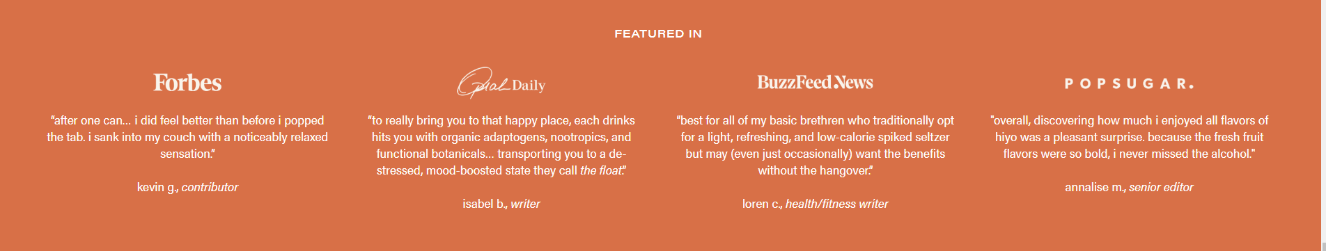 “we aren’t just subbing out alcohol with a boring soda + lime or non-alc beer with no functionality. we believe that in order to be leaders of change, this new option has to be more rewarding than the status quo. hiyo is the better-than-alcohol alternative.™ better because of the premium, organic ingredients we source from across the globe; better because of the 'float' feeling those ingredients produce; better because of flavors so delicious that you crave them not chase them; better because it’s a decision that you can enjoy now and one you’ll be proud of later”
